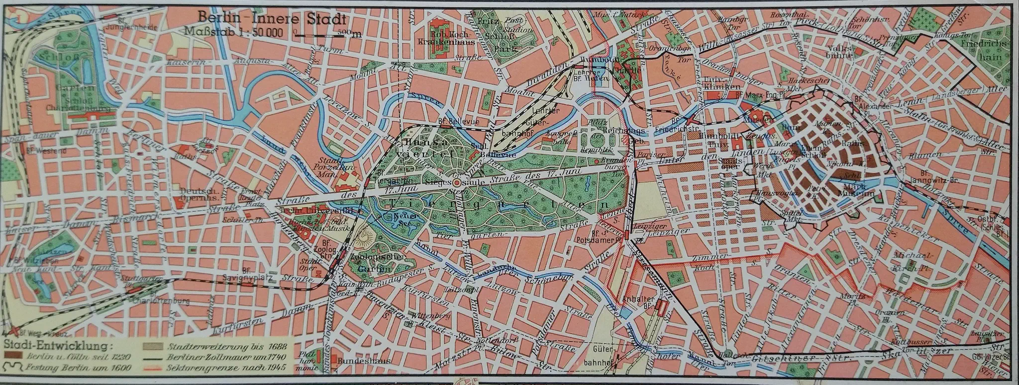 Having not been to Berlin before I’d never appreciated that what was East Berlin included most of the old centre of Berlin. The Brandenburg Gate, just beyond the wall in the former East, was built as one of the most westerly of the 18 gates in the old customs wall from the 1730s (black border). Of the older Berlin Fortress (crenulated black line) there is almost no sign apart from the erratic wiggles of some streets. After the customs wall was completed the ramparts of the fortress were demolished, which were already in a poor state of repair at that point. The customs wall itself was removed in 1860 as Berlin expanded into the surrounding suburbs.