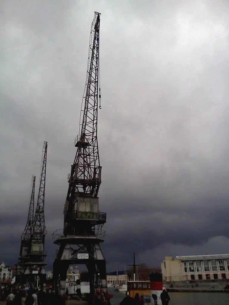 Standing behind the floor to ceiling glass we watched the rain coming in, soaking the harbour and washing the boats in a grey streams. The skeletal cranes outside stand stoic and silent, letting the drops run over them and down into the harbour, their empty cabins looking down at the people huddled for shelter below their brothers.