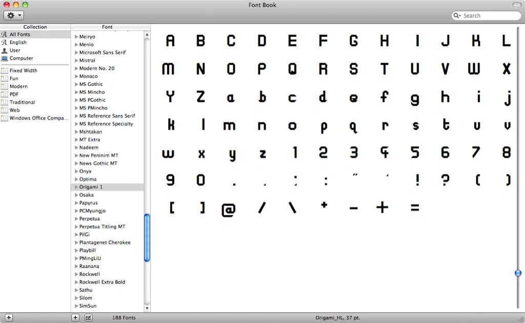 I created the TrueType Font (TTF) with Online Font Converter , but the font is monospaced as I couldn’t adjust the spacing per glyph in Inkscape. Also TTF fonts limit you to being a silhouette, so the shading of the folds can’t be seen, which removes most of the novelty and it just looks like any other blocky font.