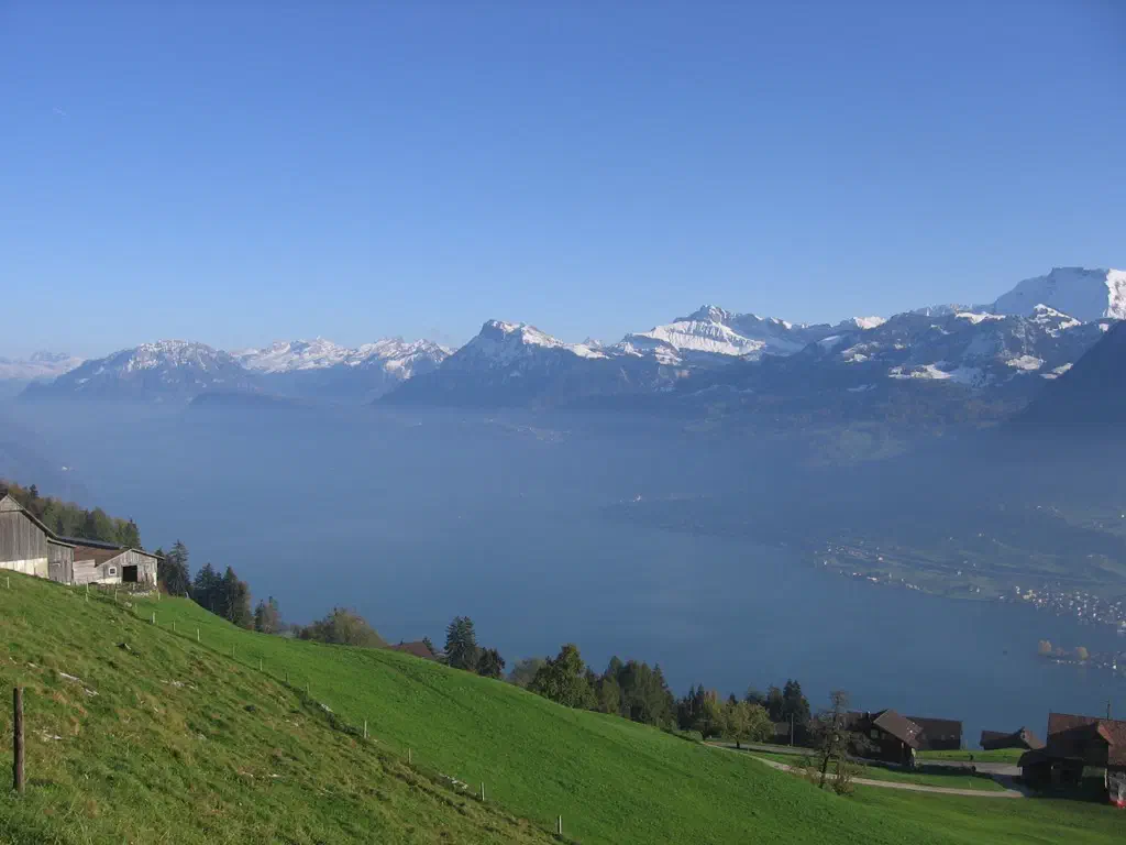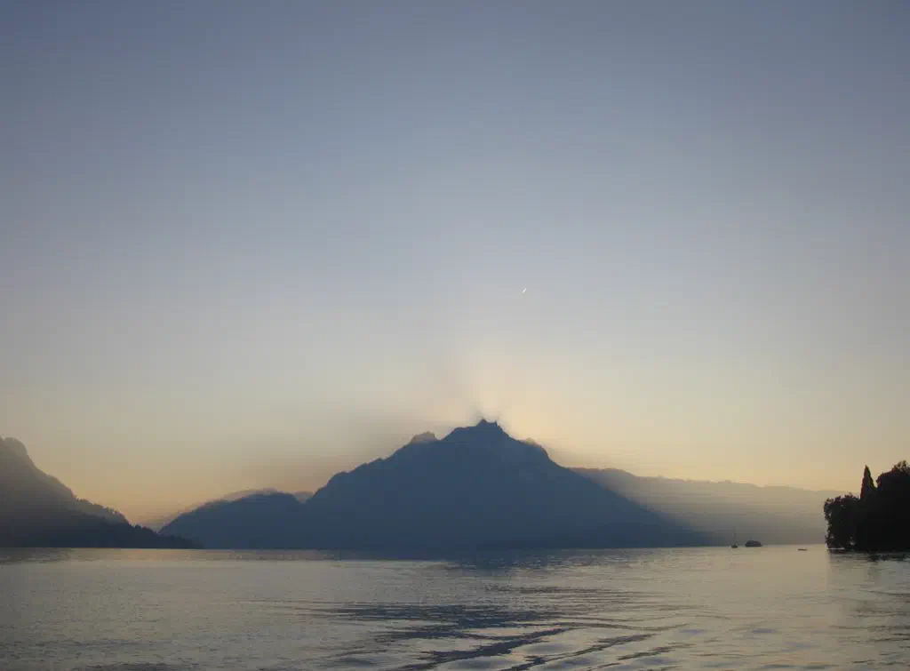 The easiest taste of the Alps is a trip to Lucern, taking the ferry from the medieval town across Lake Lucern lets you get close to some local peaks, dominated by Mount Pilatus. In October returning in the early evening allows you to see the sun set behind it. On a hazy day with the sun streaming from behind, it gives the sharp blue-grey sky an orange fan tail.