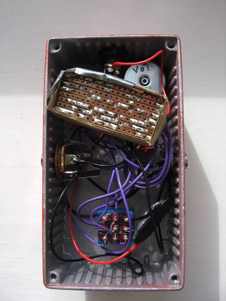 The other reason for this choice is that Devi has published the schematic for this pedal, which along with the stripboard/vero layout, guided my build. If you’re using this stripboard layout be warned that while the legs of the transistors are labelled correctly the MPSA18 transistors I bought have the flat side on the other side to that show in the layout, so double check the data sheet before you solder them into place. All the components were bought from Bitsbox.co.uk , apart from the enclosure which I got from Gap Co .