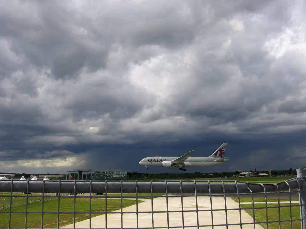 Shorty flying display by the Qatar bound 787 under moody skies.