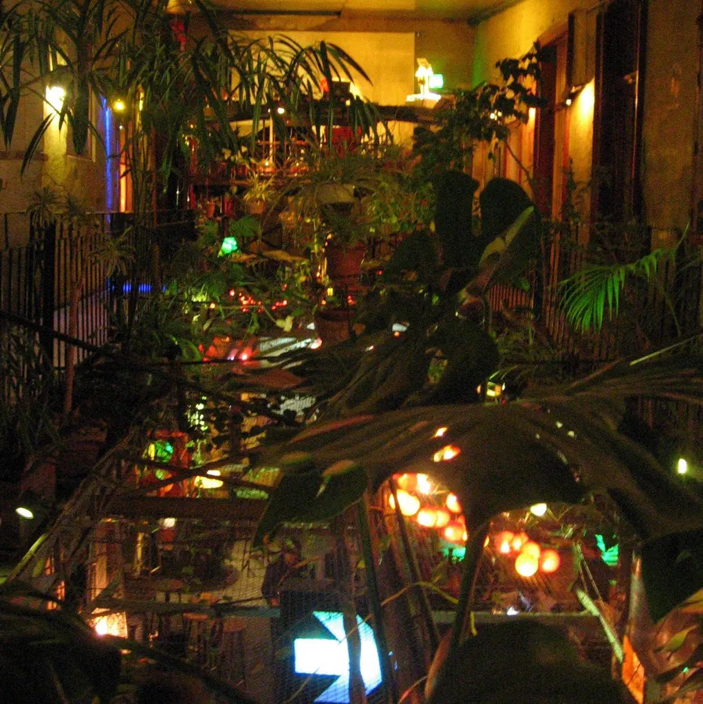 After watching more people head through the industrial plastic curtains of Szimpla’s entrance, Ste and I head across. The inside is graffitied bare concrete walls that are colourfully lit with a variety of fairy lights. The centre has an atrium filled with ferns and palms. A DJ is playing generic dance music loudly from his command and control booth on the top floor. For a Monday night it’s quite busy, but there isn’t a serious hard partying buzz, understandable given it’s the start of the week. Most of the other drinkers appear to be tourists like us, but mostly in bigger groups, as well as students.