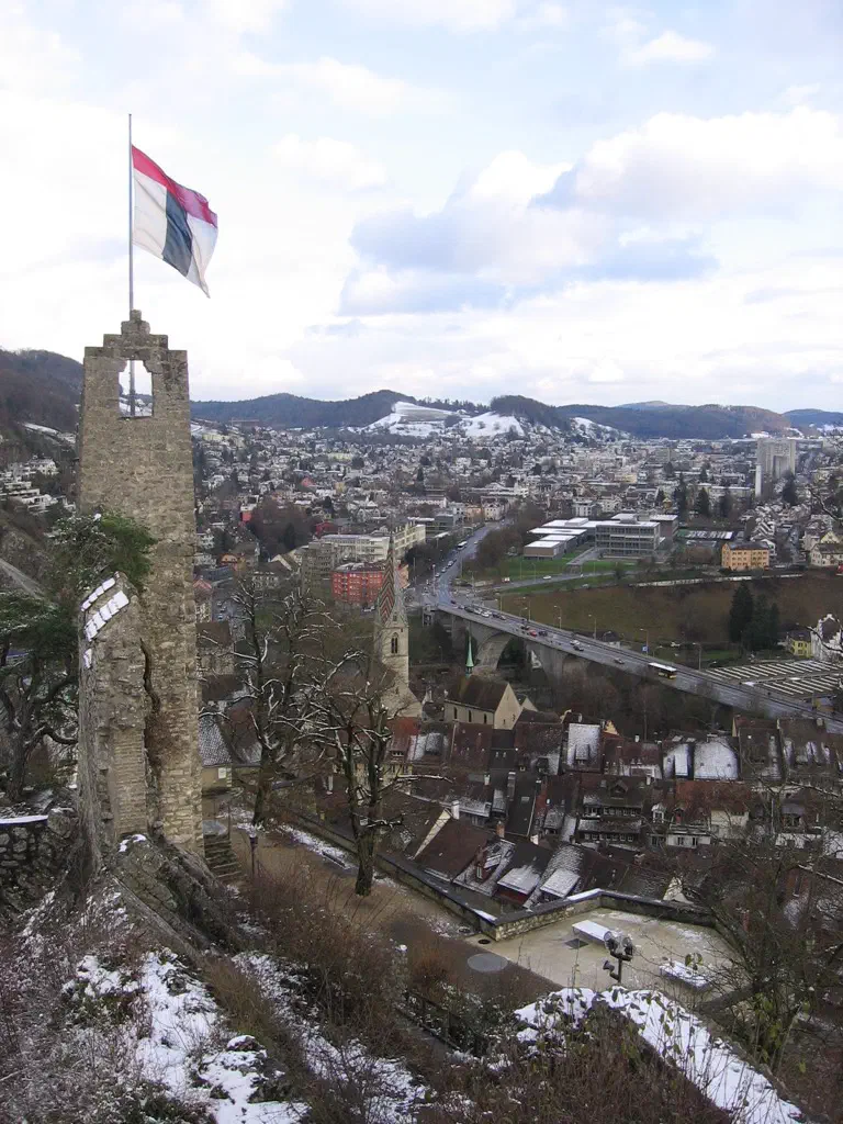 To warm from the cold up we decide to head back towards Zurich and get out at Baden, named after the hot mineral springs that rise out of the ground there, which Derek and I hope to try out. Our plan is thwarted by heavy construction works as the baths are being renovated. Looking through the wire mesh fence into the hole where the baths were we see nothing but diggers, mud and a jumble of plastic pipes. It might be warm mud, not that it looks like it, but we give it a miss. Instead we walk along the River Limmat, then climb up to the town centre and onwards through tiny staircase side streets to the ruin of Stein Castle. From the remains, which still fly the flag of Baden, we can see down onto the jumble of houses and the churches with their multi coloured tiled roofs.