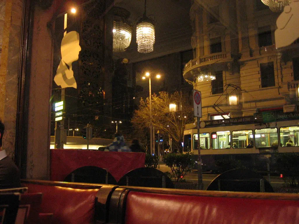 In the evening Derek and I head to the Cafe Odeon in the Bellevue area of Zurich. The interior is mostly gold, mirrors and marble, almost like some of the churches I’ve seen, but with massive crystal chandeliers hanging from the ceiling throwing out masses of scattered twinkling light. Space is tight, but we find a marble table near a window and relax on the red leather benches. The crowd seems an interesting mix of middle aged theatre goers and tourists, most busy around the central bar, chatting and making exaggerated hand movements. Outside trams rattle by, going to and from the busy interchange on Bellevue place.